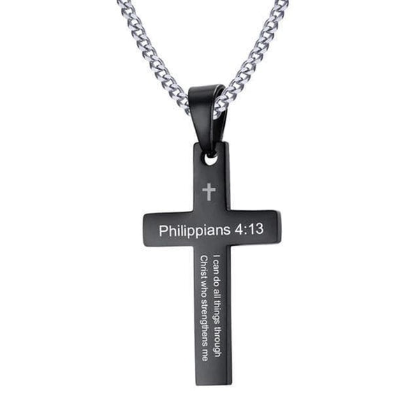 Bible Verse Cross NecklaceMetal: Stainless SteelMeasurements:Chain: 50cmPendant: 50.5mm x 34.5mmFeatures:Bible Verse Cross Necklace Comes with an elegantly designed and sturdy gift box that is ideal for storing and presenting jewellery.