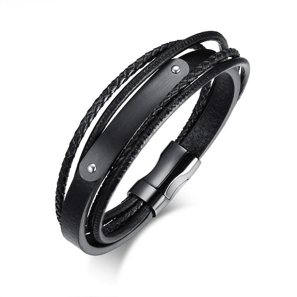 Double-Deck Black Leather ID Bracelet