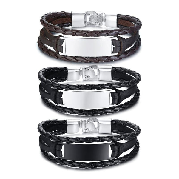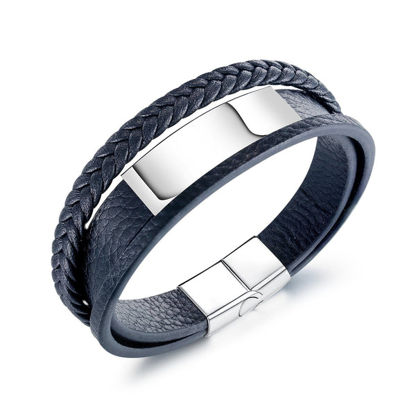 Stainless Steel Mens Engraving ID Bracelet Braided Leather Bracelet