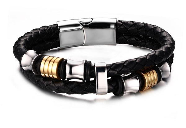 Men's Gold Beads Black Braided leather bracelet Metal: Leather Measurements: Length: 20.8cm Bar: 14mm Men's Gold Beads Black Braided leather bracelet Comes with an elegantly designed and sturdy gift box...