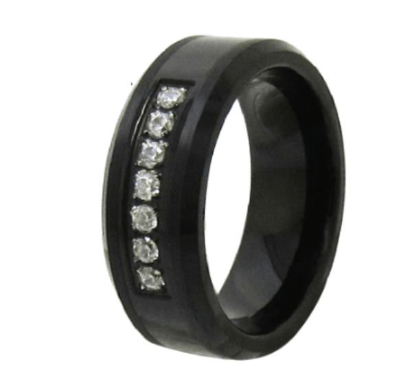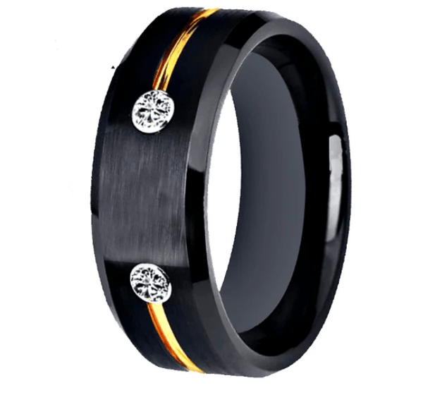 Tungsten CZ Gold Inlay Wedding Ring Modern and Stylish, this sophisticated tungsten wedding band in a deep black is brought to life with gold detailing and sparkling cubic zirconias. The...