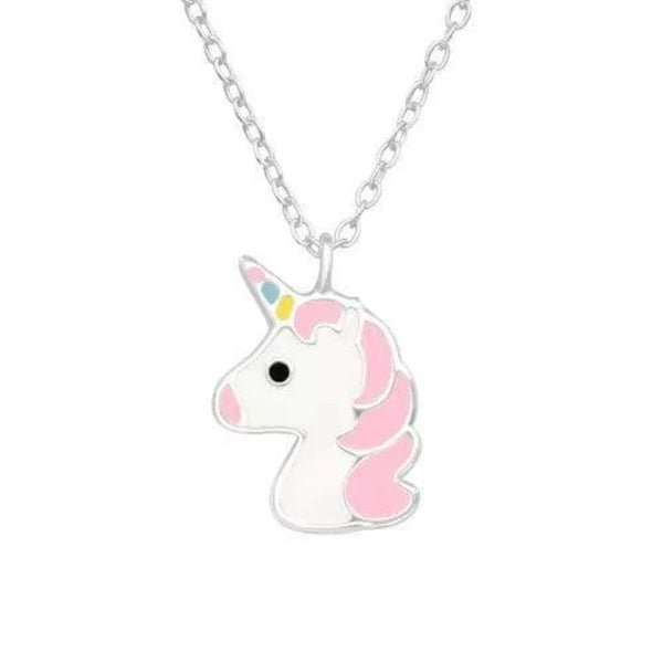 Children's Silver Crystal Unicorn Necklace Metal : Sterling Silver Measurement : Size : 7 mm x 10 mm Crystal Stones : 3 Color : White, Light Pink Glitter, Black Chain : Total Length...