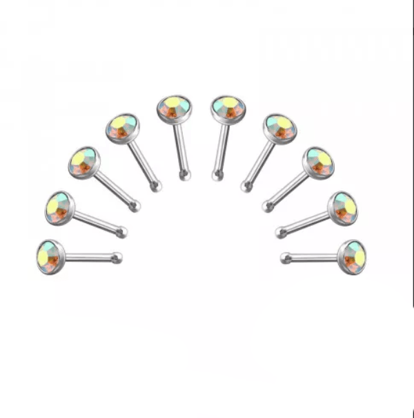 3 mm AB Crystal Round Nose Stud - Body Jewellery 10 piece Set.