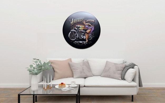 American Classics Round Metal Tin Sign Poster will adorn the look and feel of your wall. This versatile and durable tin sign, metal wall poster can be stuck in any corner of your room, office, shop, shed, garage or store and it will look just as great. Imported Iron. Fashion & Retro Quality Tinned Skin. Four pre-drilled holes for hanging or you may use double-sided tape.