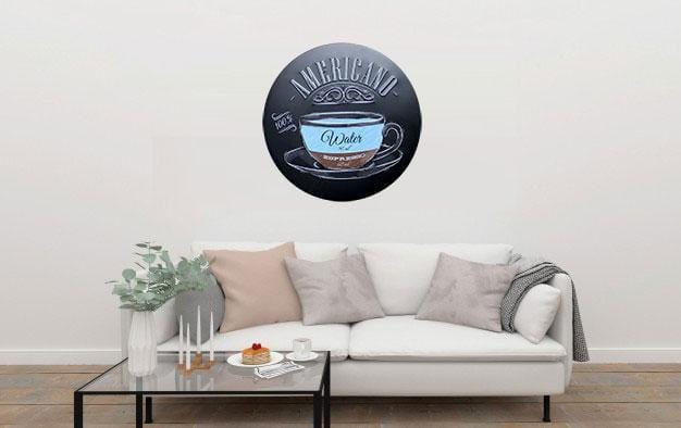 Americano Water Round Metal Tin Sign Poster will adorn the look and feel of your wall. This versatile and durable tin sign, metal wall poster can be stuck in any corner of your room, office, shop, shed, garage or store and it will look just as great. Imported Iron. Fashion & Retro Quality Tinned Skin. Four pre-drilled holes for hanging or you may use double-sided tape.