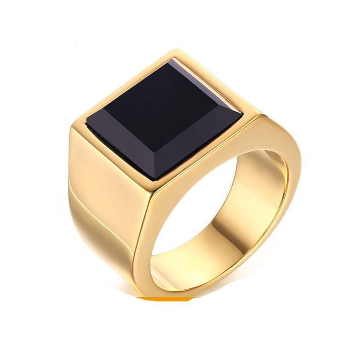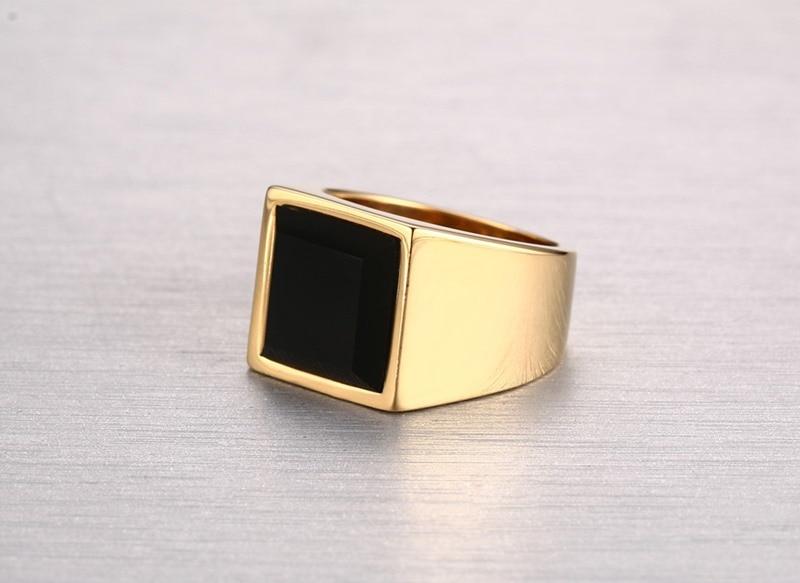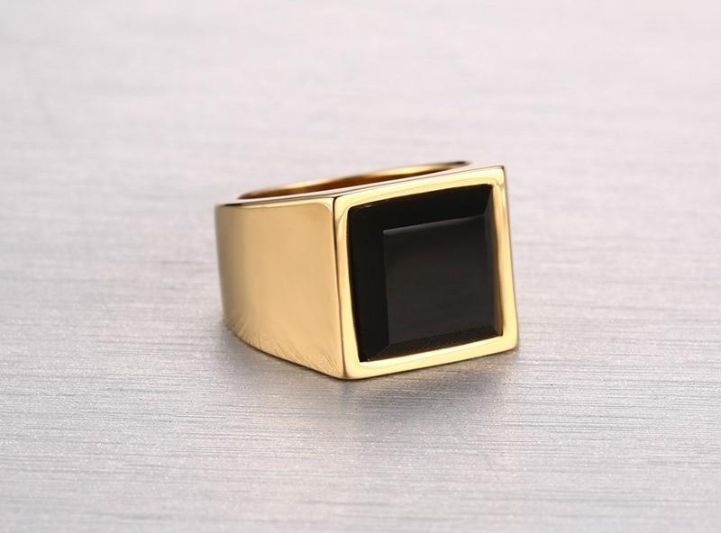 Black and Gold Mens Ring Elegant, refined and perfect for pairing with business attire, this stunning black and gold ring is a must-have for your accessories collection. The stunning rectangle cut of the black gemstone and the beautiful high-polish gold finish give this ring a versatile look that will go with almost every outfit.