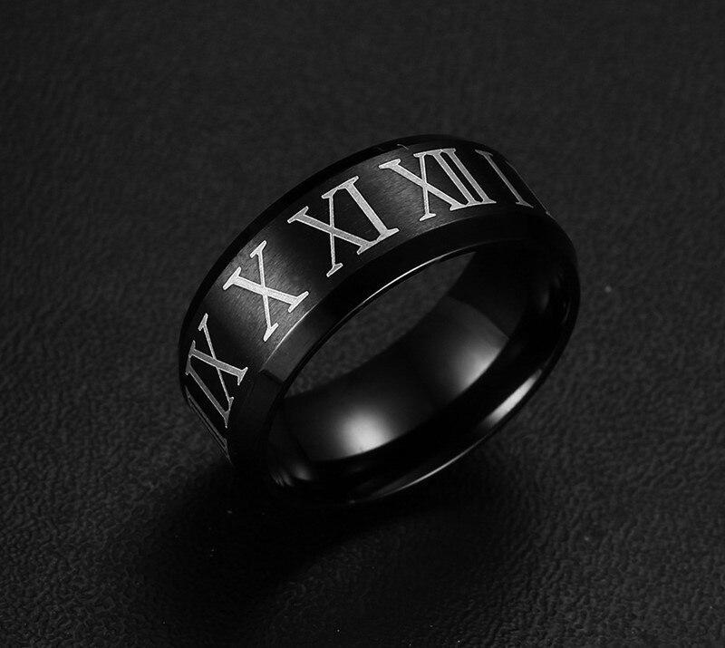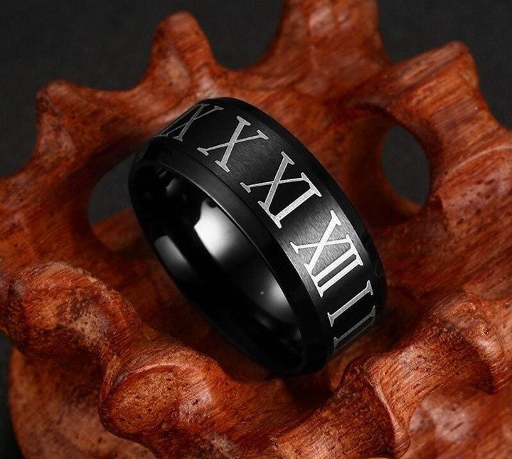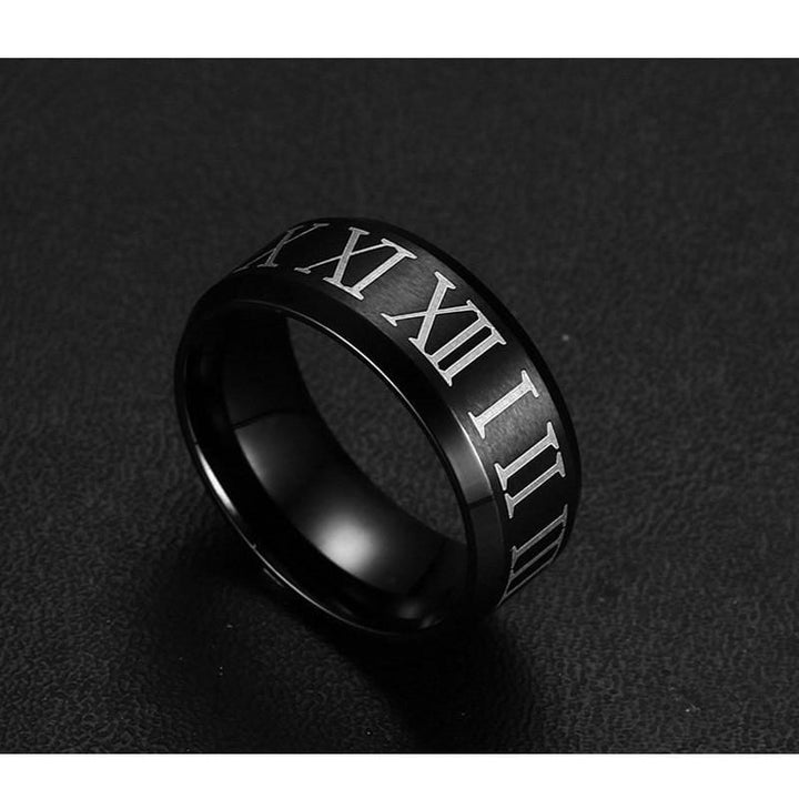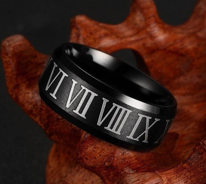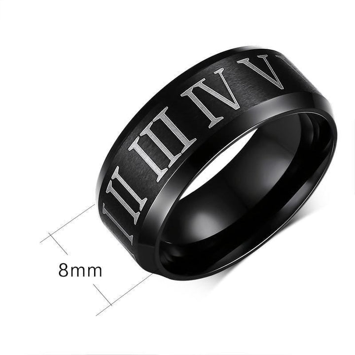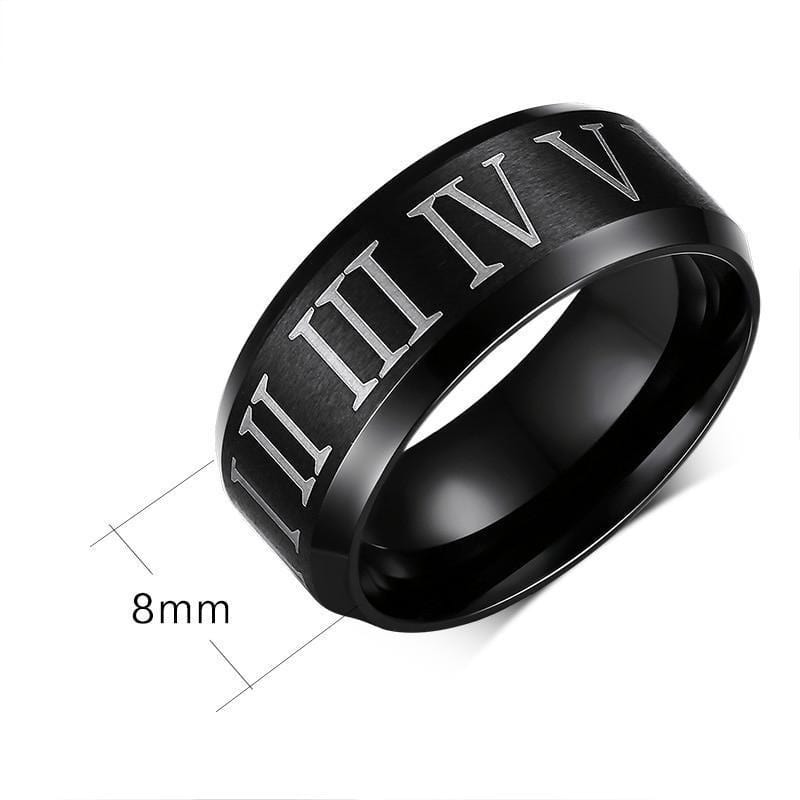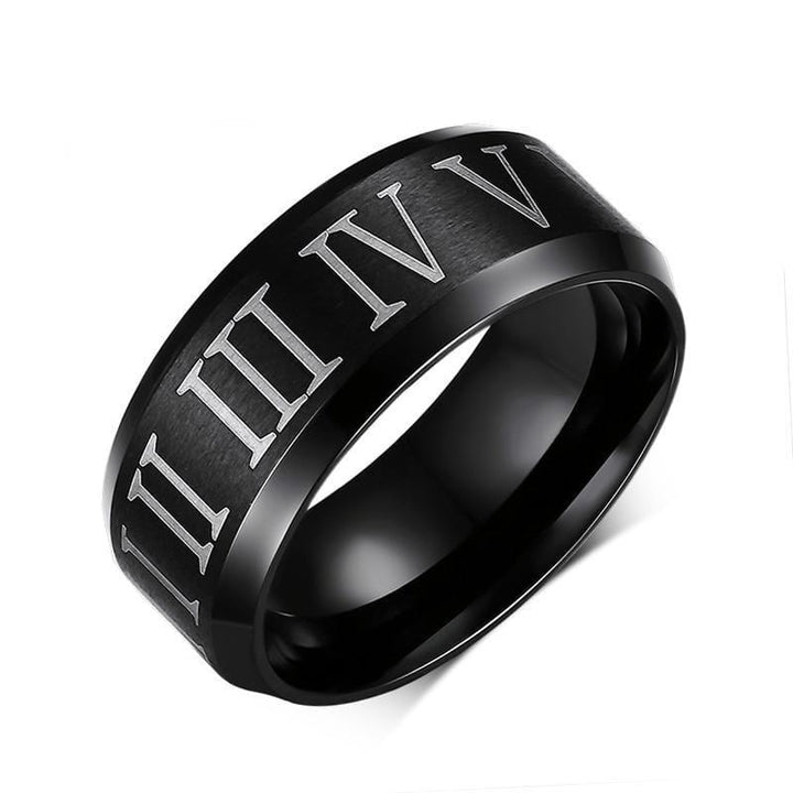 Add a bit of elegant flare to your outfit with this stunning roman numeral ring. Crafted from black stainless steel, this ring has a beautiful matte finish which contrasts perfectly against the bright silver of the roman numeral engravings.
