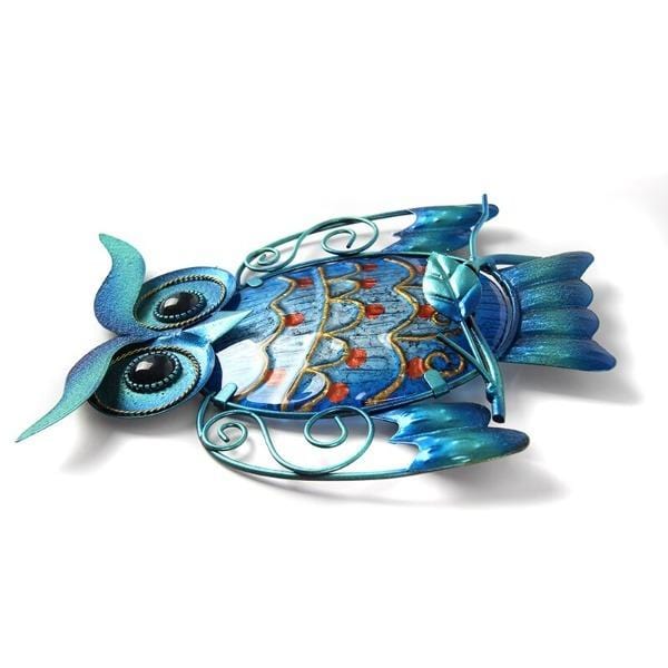 Add metallic accents to your interior by adding this stunning blue metal owl to your interior decor. The owl is crafted with a combination of coloured glass and high quality metals and is decorated with delicate beading and hues of blue, green, orange and yellow. This metal artwork is suitable for both indoor and outdoor use.