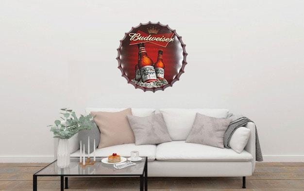 Budweiser Beer Cap Metal Tin Sign Poster will adorn the look and feel of your wall. This versatile and durable tin sign, metal wall poster can be stuck in any corner of your room, office, shop, shed, garage or store and it will look just as great. Imported Iron. Fashion & Retro Quality Tinned Skin. Four pre-drilled holes for hanging or you may use double-sided tape.