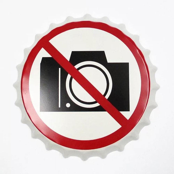 Camera Not Allowed Beer Cap Metal Tin Sign Poster will adorn the look and feel of your wall. This versatile and durable tin sign, metal wall poster can be stuck in any corner of your room, office, shop, shed, garage or store and it will look just as great. Imported Iron. Fashion & Retro Quality Tinned Skin. Four pre-drilled holes for hanging or you may use double-sided tape.