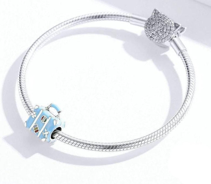 Colorful Silver Suitcase Charm. Add a pop of colour to your charm bracelet with this kitschy suitcase charm. The charm is crafted with sterling silver and is made colorful with high-quality resin. With a multi-fit centre this charm can be slipped onto bracelets, added to keychains and used on necklaces as a pendant.