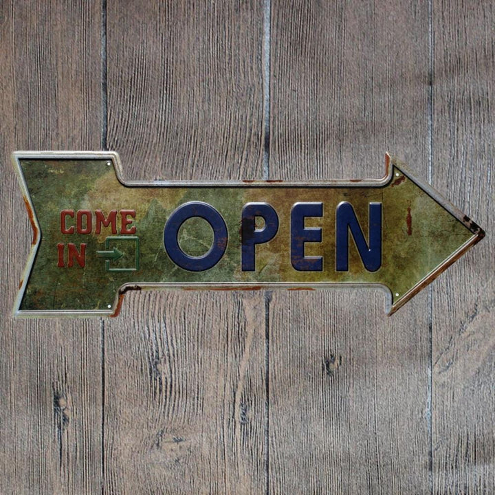 Come in Open Arrow Metal Tin Sign Poster will adorn the look and feel of your wall. This versatile and durable tin sign, metal wall poster can be stuck in any corner of your room, office, shop, shed, garage or store and it will look just as great. Imported Iron. Fashion & Retro Quality Tinned Skin. Four pre-drilled holes for hanging or you may use double-sided tape.