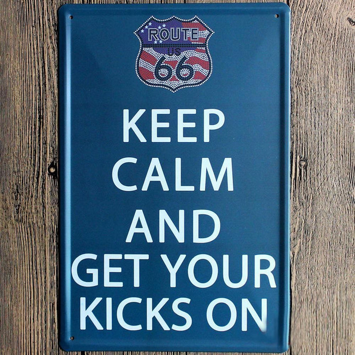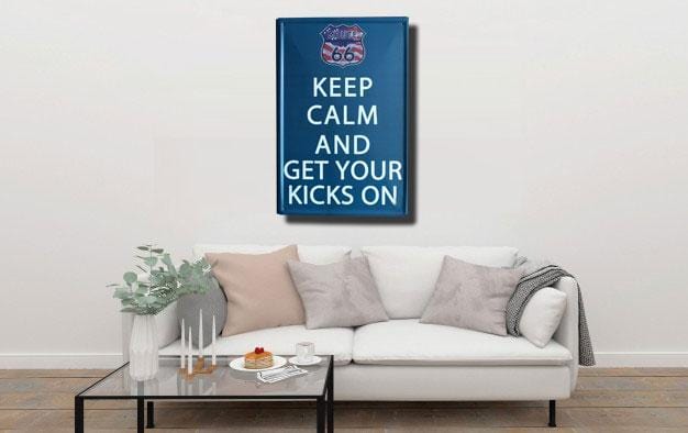 Keep Calm and Get your Kicks on Metal Sign Poster - Wall metal tin poster will adorn the look and feel of your wall. The wall poster has dimensions of 20 x 30 cm and can be stuck in any corner of your room and it will look just as great.