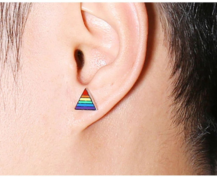 LGBT Pride Stainless Steel Triangle Rainbow Stud Earrings for men and women. Measurements: 9mm x 10mm