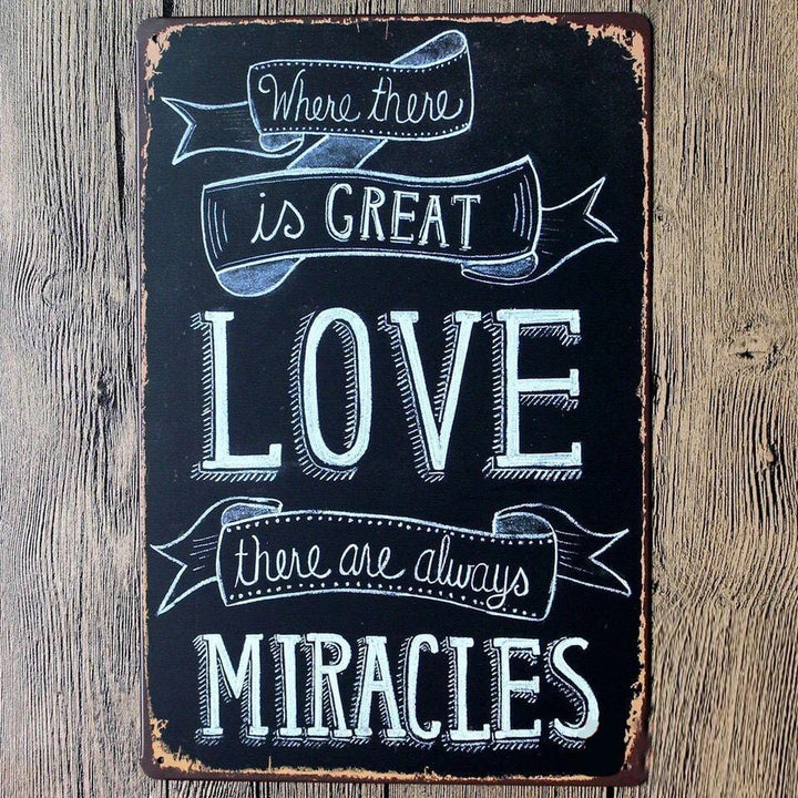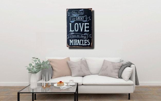 Love and Miracles Quote Metal Tin Sign Poster - Wall metal tin poster will adorn the look and feel of your wall. The wall poster has dimensions of 20 x 30 cm and can be stuck in any corner of your room and it will look just as great.