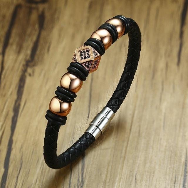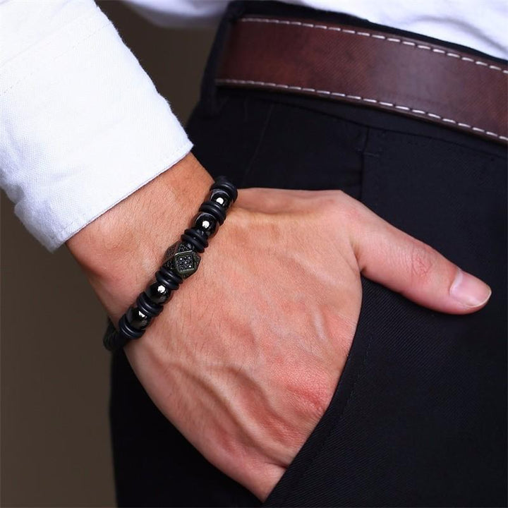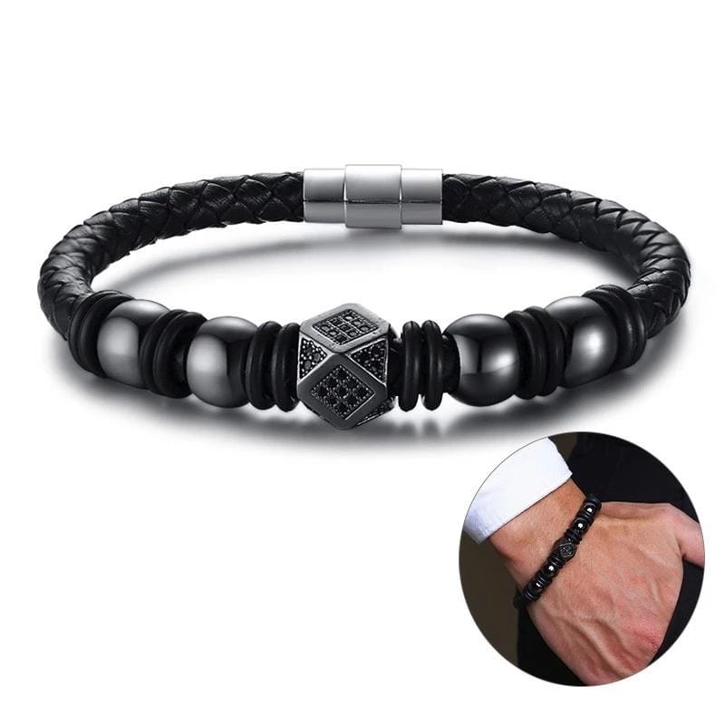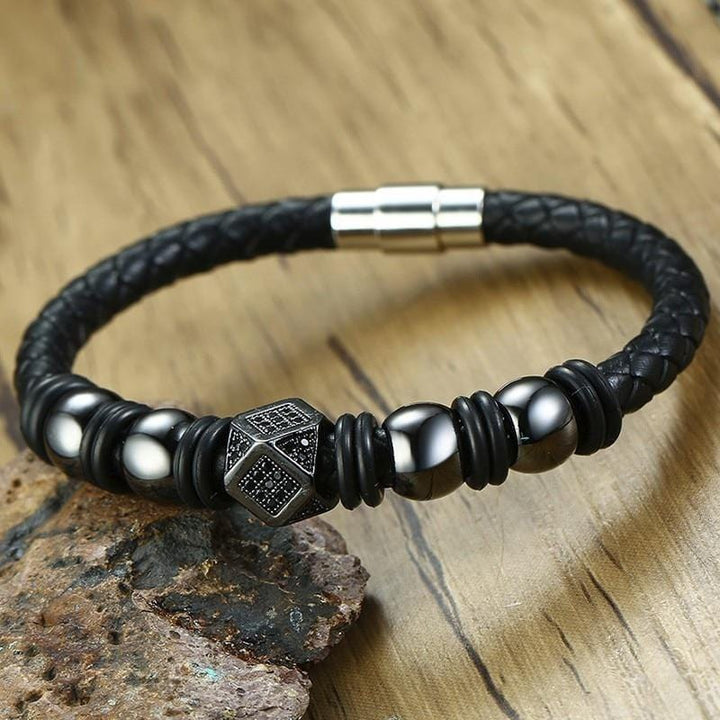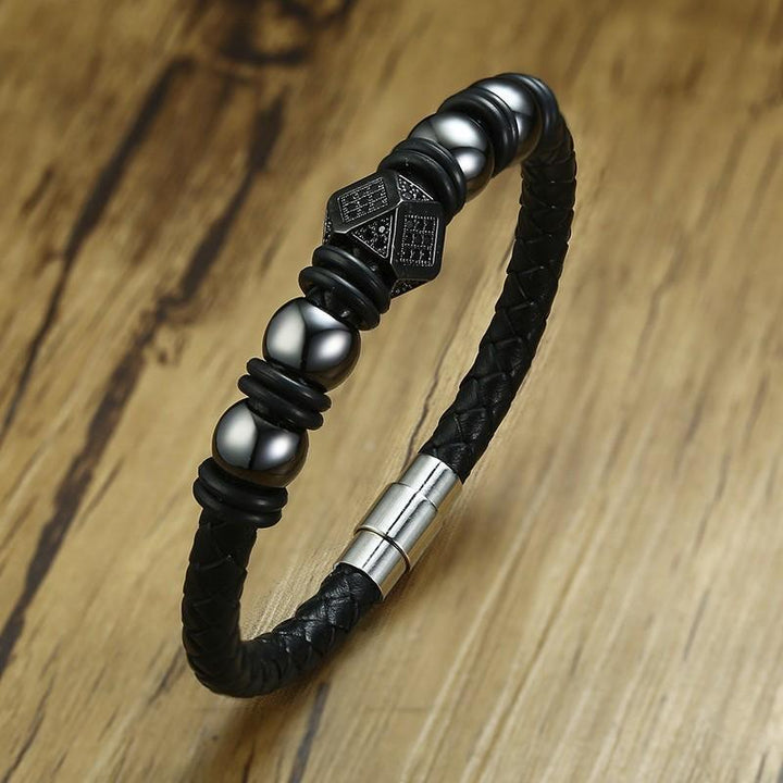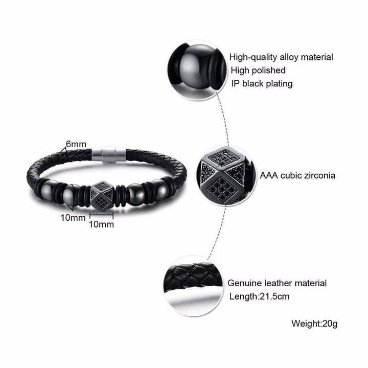 Gorgeously crafted using genuine leather this bracelet features intricate beading and a stunning high polish black plating. The geometric centre bead on this bracelet also features some beautiful sparkling zirconia crystals.