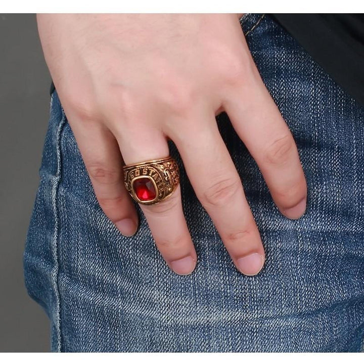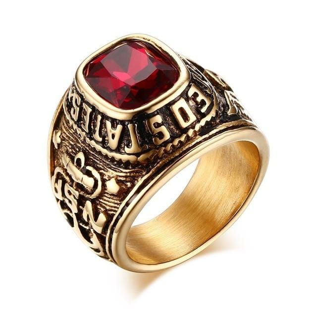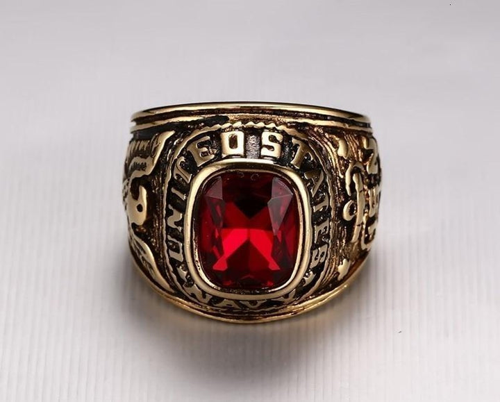 Feeling patriotic, why not add this US style Navy ring to your collection. The thick ring band is intricately engraved and features golden eagles, navy text and an oxidised finish for that vintage look. The ring also features a sparkling semi-precious stone at its heart for that extra bit of bling.