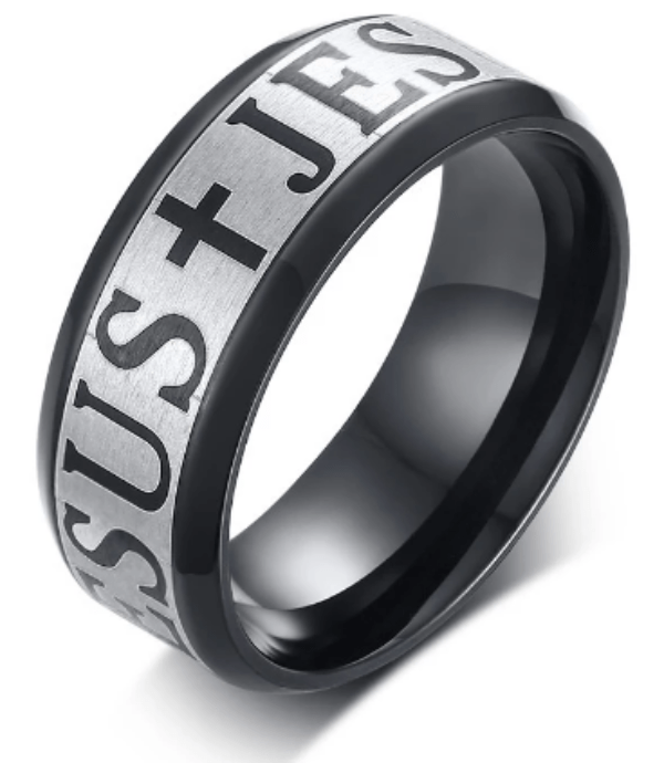 Keep the faith with this stunning stainless steel Jesus ring. The ring features a two tones look with borders of black and a matte silver centre band and also features crosses and the word Jesus.