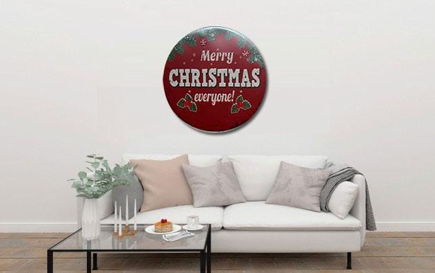 Merry Christmas Everyone Round embossed Metal Tin Sign Poster will adorn the look and feel of your wall. This versatile and durable tin sign, metal wall poster can be stuck in any corner of your room, office, shop, shed, garage or store and it will look just as great. Imported Iron. Fashion & Retro Quality Tinned Skin. Four pre-drilled holes for hanging or you may use double-sided tape.
