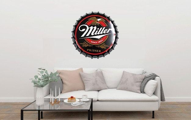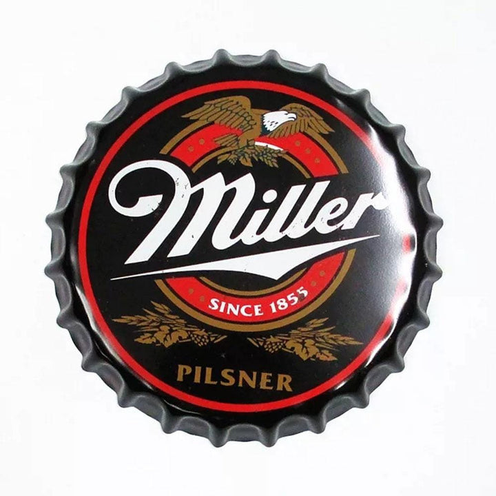 Miller Beer Cap Metal Tin Sign Poster will adorn the look and feel of your wall. This versatile and durable tin sign, metal wall poster can be stuck in any corner of your room, office, shop, shed, garage or store and it will look just as great. Imported Iron. Fashion & Retro Quality Tinned Skin. Four pre-drilled holes for hanging or you may use double-sided tape.
