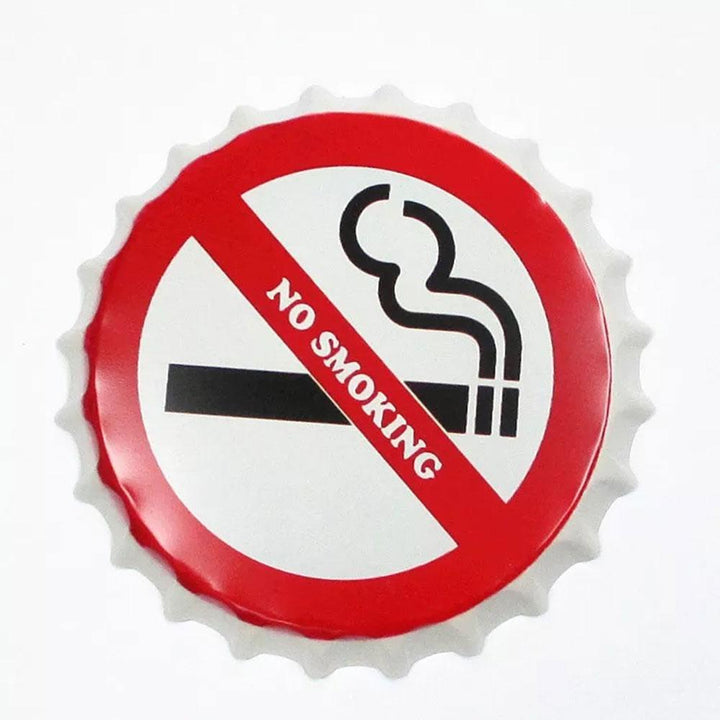 No Smoking Beer Cap Metal Tin Sign Poster will adorn the look and feel of your wall. This versatile and durable tin sign, metal wall poster can be stuck in any corner of your room, office, shop, shed, garage or store and it will look just as great. Imported Iron. Fashion & Retro Quality Tinned Skin. Four pre-drilled holes for hanging or you may use double-sided tape.