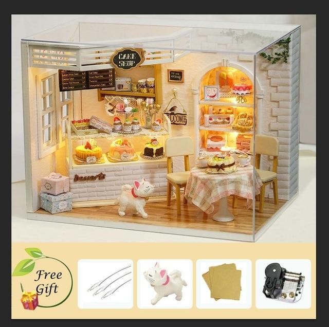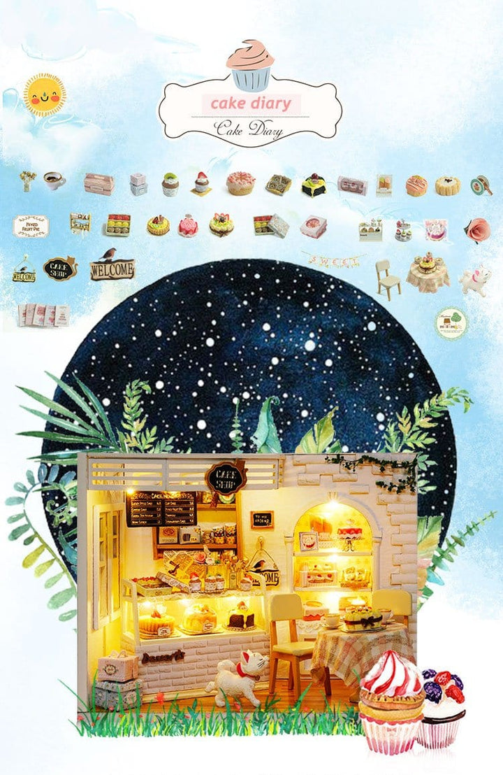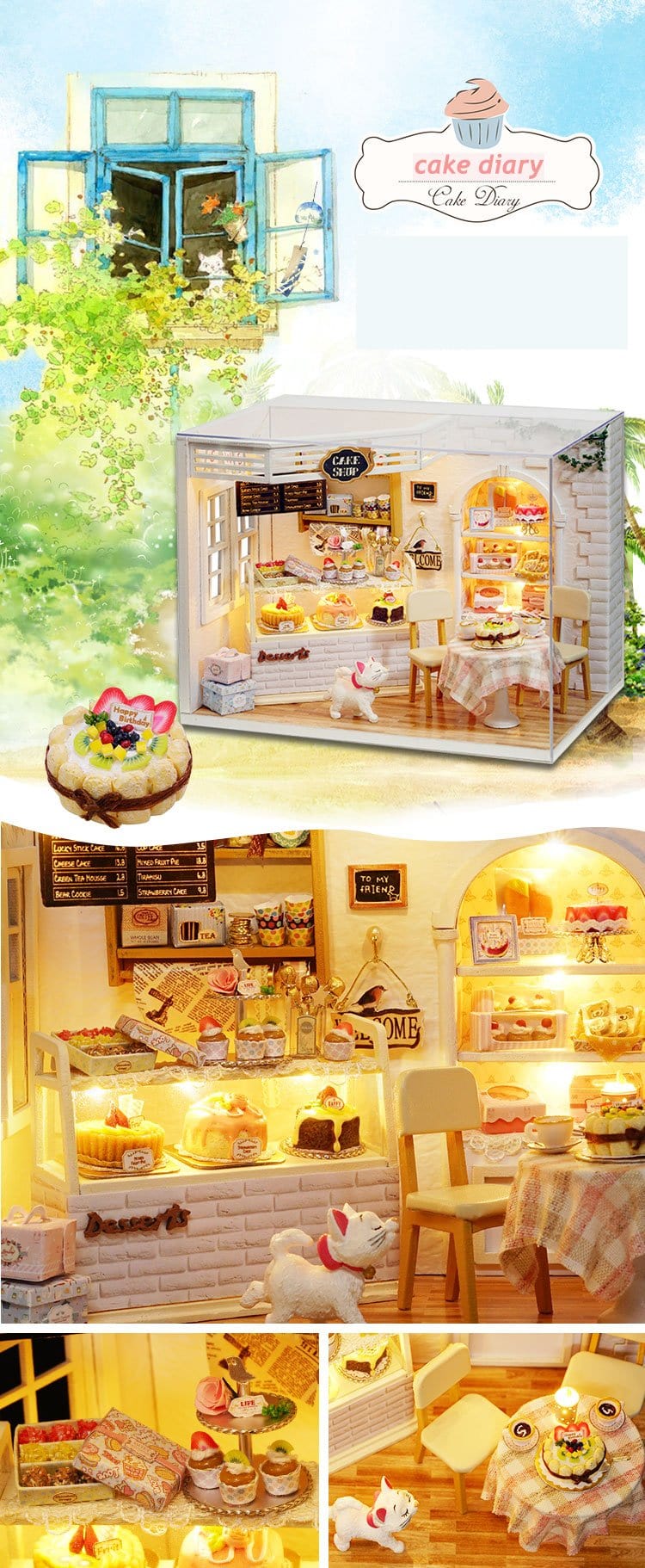 Endearing and cute, this dollhouse has been expertly created after using a selection of wood, fabric, paper, resin, plastic, and metal. The miniature café includes a dining set, a cake window, and an edgy inner-wall sweets display. There is also a cute cat strutting its stuff across the scene.