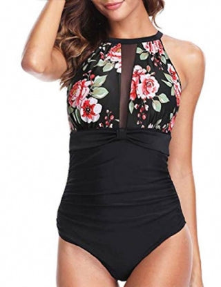 Make a splash with this gorgeous printed swimsuit. Featuring a halter top and a mesh peek-a-boo centre this design is modern and flattering. The black of the swimsuit creates a slimming look while the patterned top adds a bit of fun to the piece.