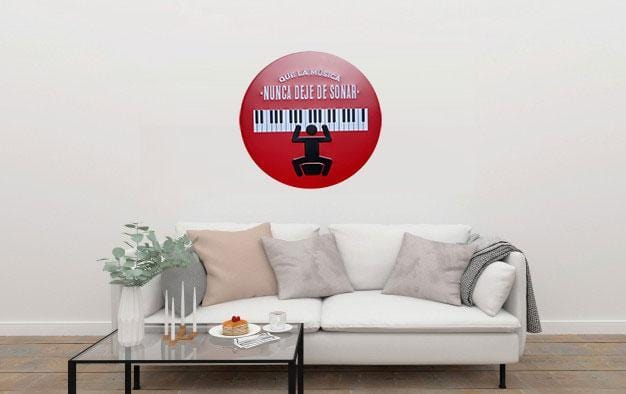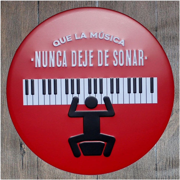 Que La Musica Round Metal Tin Sign Poster will adorn the look and feel of your wall. This versatile and durable tin sign, metal wall poster can be stuck in any corner of your room, office, shop, shed, garage or store and it will look just as great. Imported Iron. Fashion & Retro Quality Tinned Skin. Four pre-drilled holes for hanging or you may use double-sided tape.