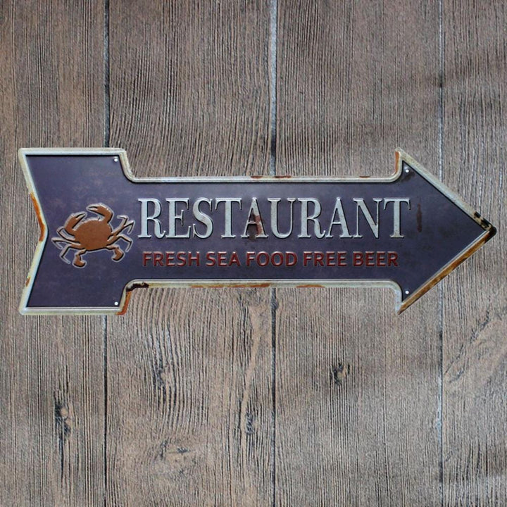 Restaurant Arrow Metal Tin Sign Poster will adorn the look and feel of your wall. This versatile and durable tin sign, metal wall poster can be stuck in any corner of your room, office, shop, shed, garage or store and it will look just as great. Imported Iron. Fashion & Retro Quality Tinned Skin. Four pre-drilled holes for hanging or you may use double-sided tape.