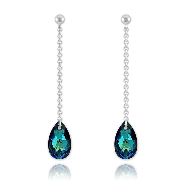 Add an air of sophistication to this gorgeous set of Swarovski crystal drop earrings. These earrings feature a small stud for extra stability, that holds two gorgeous teardrop crystal using a glittering silver link chain. The crystals themselves feature an attractive cut that is further highlighted by gorgeous hues of sapphire blue,emerald green and amber.