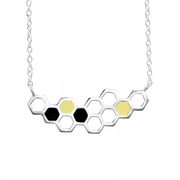 Geometric in design with a natural look, this necklace is a unique piece to add to your jewellery collection. It is crafted from sterling silver with a unique high polish finish. It's centre charm is designed to look like the inside of a beehive and is decorated with coloured epoxy.