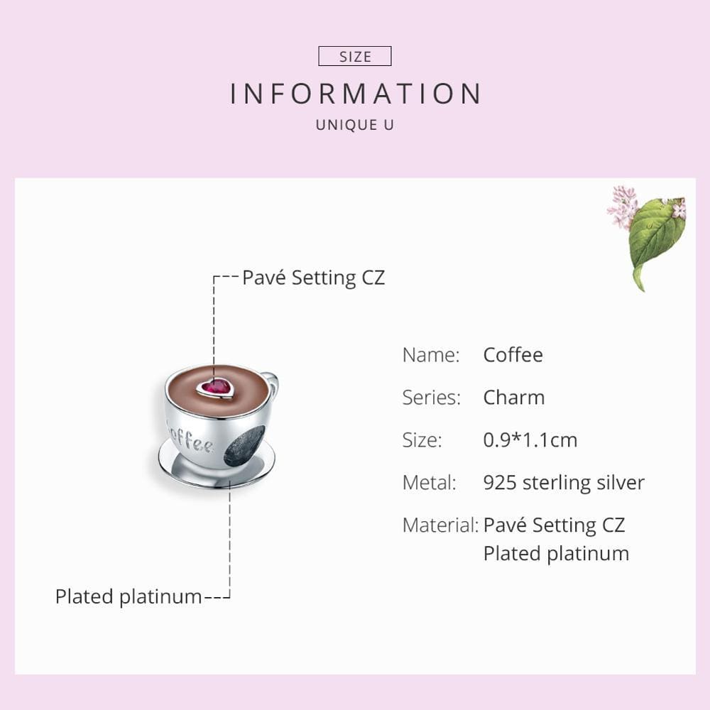 Silver Coffee Cup Charm Bead. This adorable coffee cup charm makes the perfect gift for the coffee addict in your household. Made from durable sterling silver and featuring a multi-fit charm opening, this charm can be added to bracelets, necklaces, and even key chains. Chain for bracelet or necklace not included and sold separately.