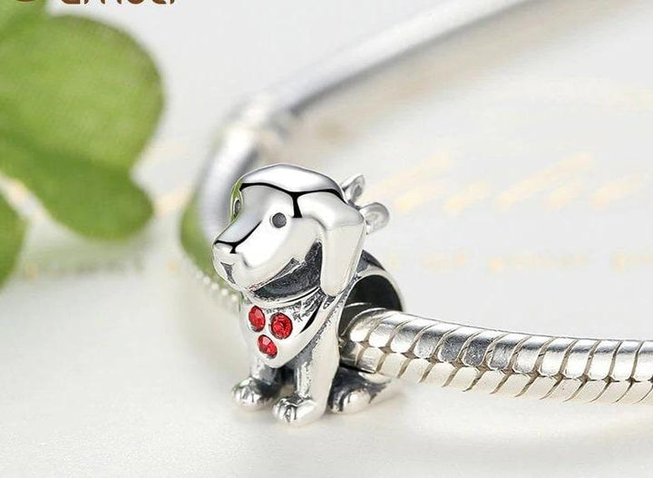 Silver Dog Charm. A cute addition to any charm bracelet, this adorable dog charm is perfect for dog and animal lovers alike. The oxidized silver of the charm gives it a vintage feel while the addition of ruby red gemstones add a pop of colour. With a multi-fit centre this charm can be slipped onto bracelets, added to keychains and used on necklaces as a pendant.