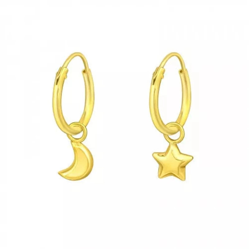 Silver Gold Hanging Moon and Star Hoops Earrings