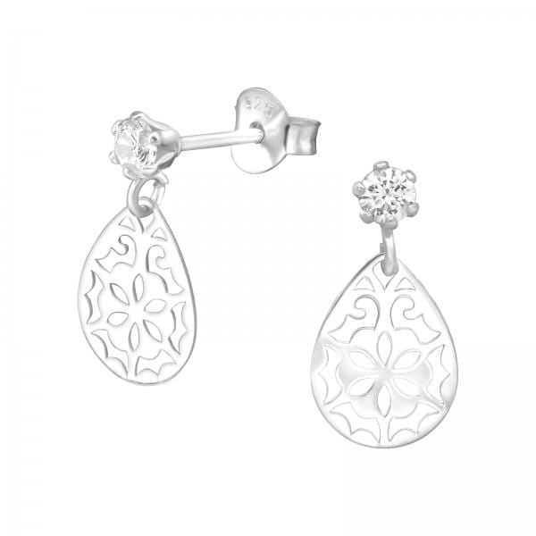 Silver Round Hanging Laser Cut Flower Stud Earrings