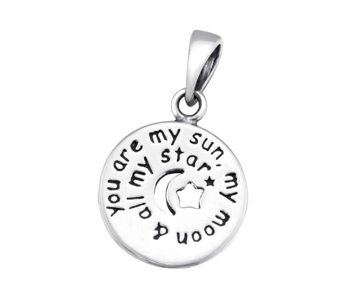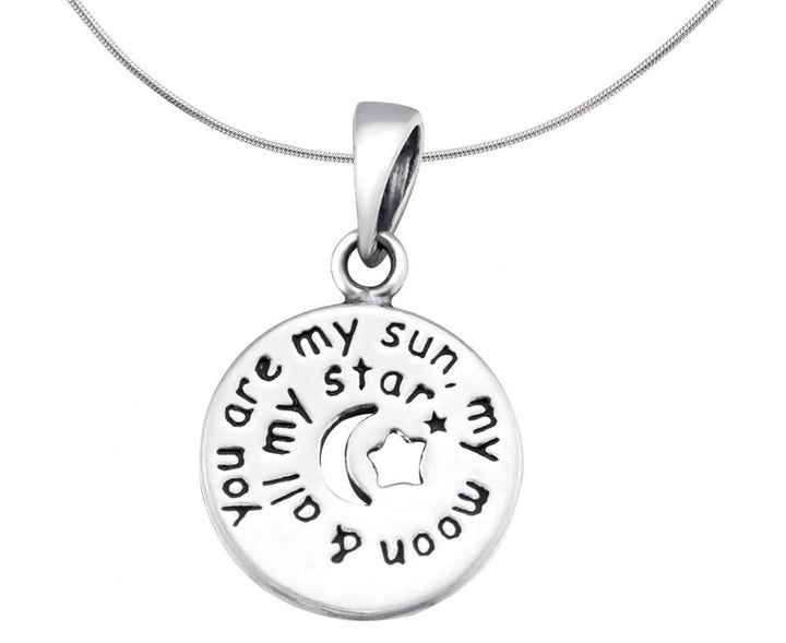This endearing piece of jewellery is perfect as a gift for friends, family or loved ones. The circular disc charm is engraved with the cute message “You Are My Sun, My Moon And All My Star”. The pendant has an oxidised look.