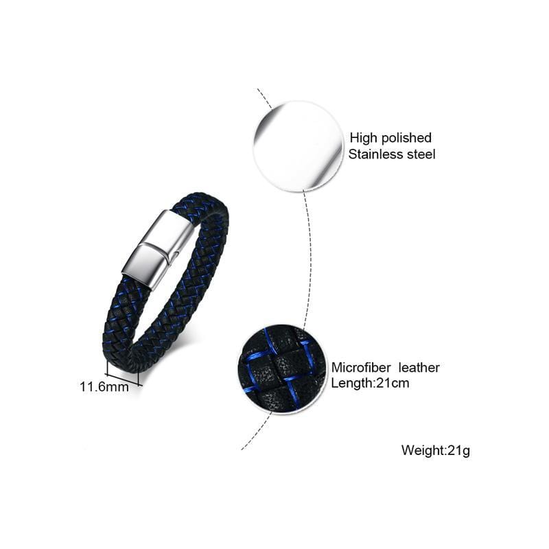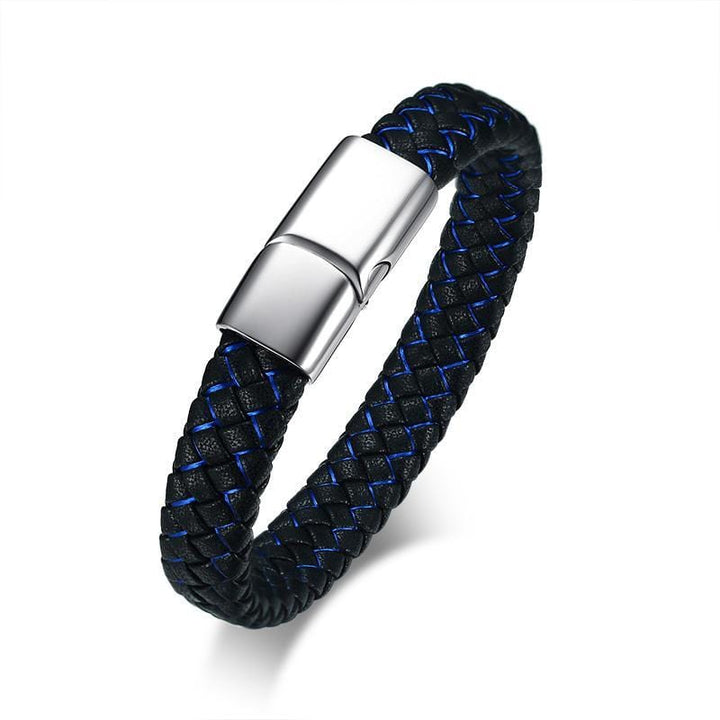 Stainless Steel Black and Blue Geniune Leather Bracelet