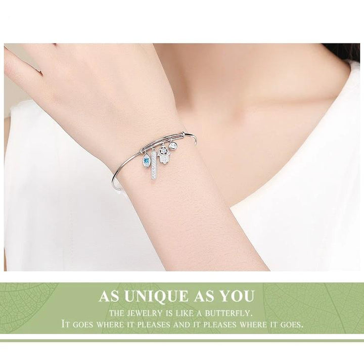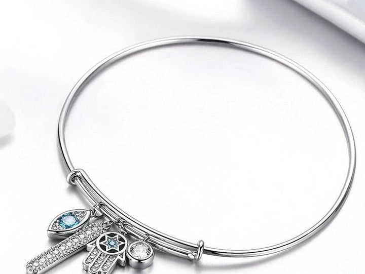 Beautiful multi-charm Sterling Silver Hamsa protective bracelet featuring 4 single paved Cubic Zirconia charms in clear and topaz blue. A beautiful gift for friends who are travelling or embarking on a new journey in their life.