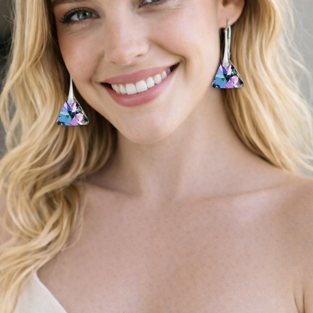 Glamorous and unique, this gorgeous set of crystal earrings are the perfect statement set for a night out on the town or for just adding a bit of sparkle to a casual ensemble. Each earring has a silver lever back clasp which holds a beautiful triangle cut crystal with a multi-inflectional face.