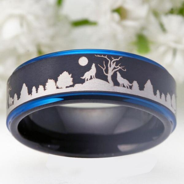 Stylish and unique, this beautiful tungsten wolf ring is the perfect addition to any men's jewellery collection. The ring is made from tungsten carbide which is scratch resistant, lightweight and hard-wearing. The band features stunning silver detailing and depicts a stunning natural landscape with two wolves howling at the moon.