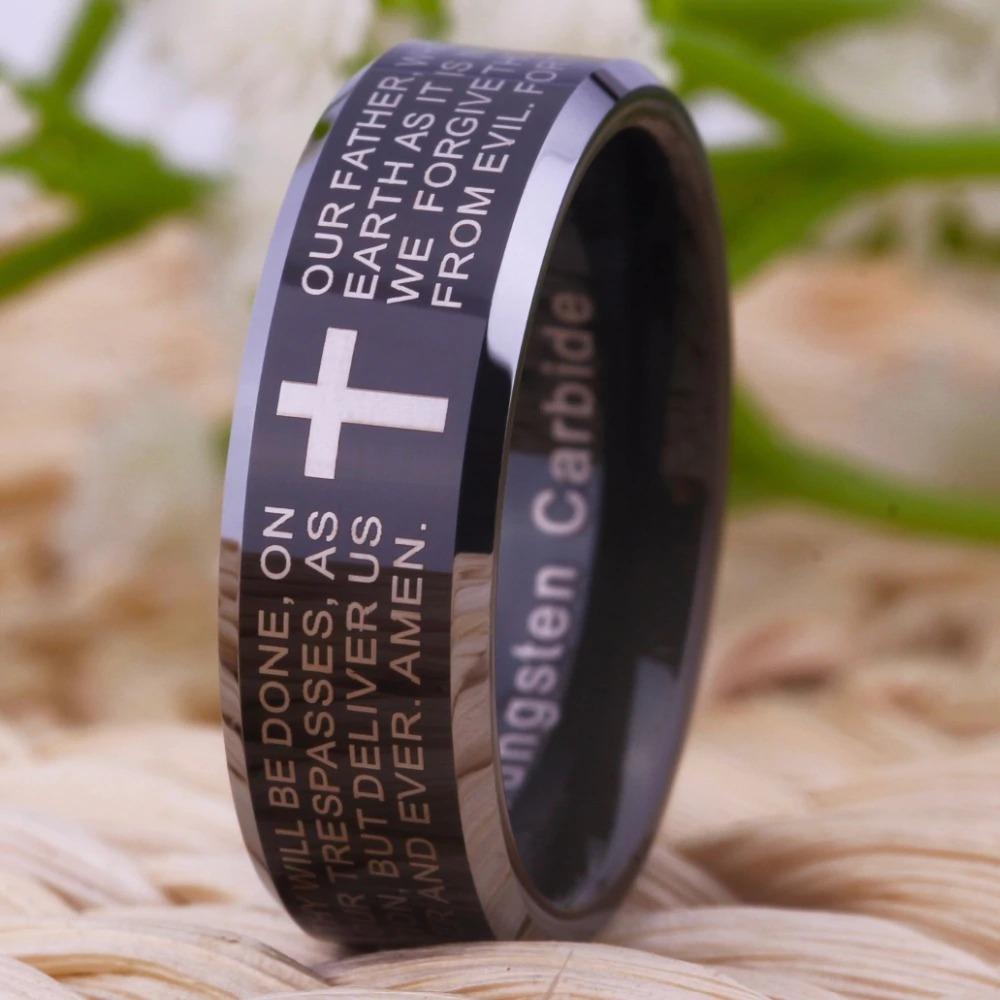 Made from high quality and durable tungsten, this stunning religious mens ring has a modern and sleek look that looks perfect when paired with any modern ensemble.The ring is inscribed with a beautiful christian message and features the image of a simple cross.