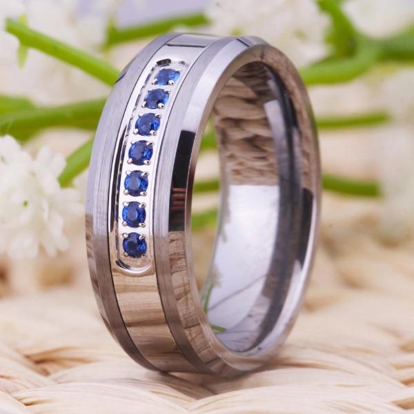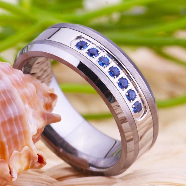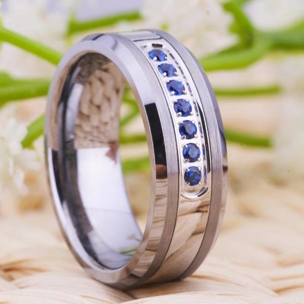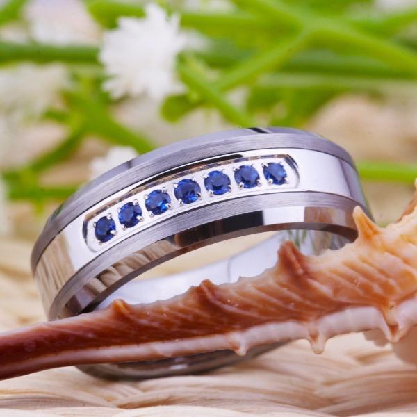 Sparkling sapphire toned cubic zircon's set in a rectangular row give this sophisticated tungsten ring a refined expression. Crafted with a high polish silver finish this tungsten will add that extra bit of sparkle to your big day.