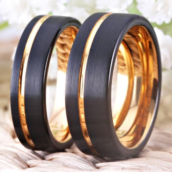 Add a classy touch to your wedding day with this set of black and Rose Gold commitment rings. Hand crafted from the highest quality tungsten, this striking set has a beautiful charcoal matte finish with high polish Rose Gold detailing for that vintage edge.