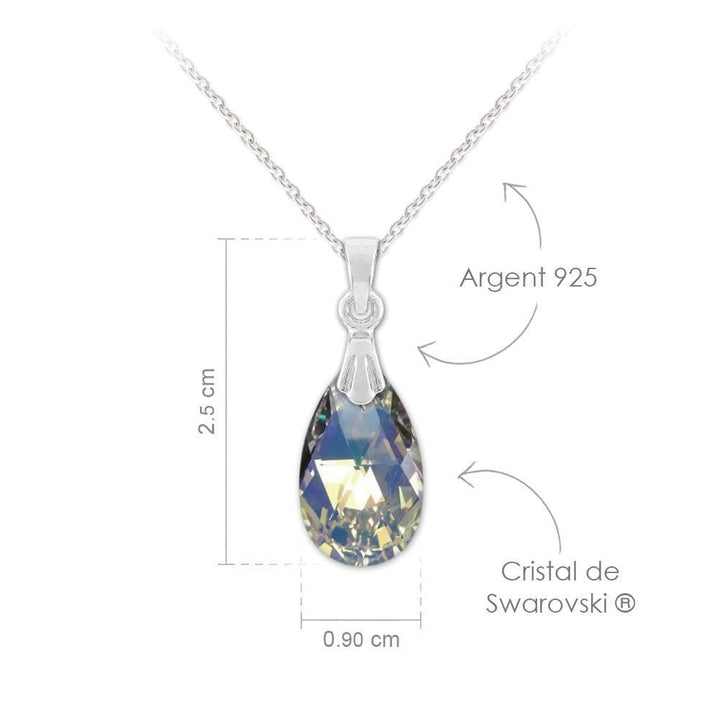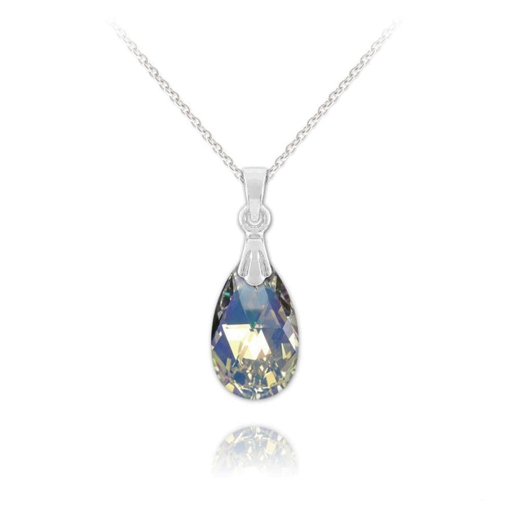 Give your wardrobe a touch of elegance and glamour with this stunning vintage style Swarovski Crystal necklace. The necklace features a delicate silver link chain and a vintage style silver clasp. This clasp holds a gorgeous pear shaped crystal with a glamorous briolette cut; giving the necklace that extra bit of sparkle. This necklace is available in a number of gorgeous colour iterations including white, green, purple,blue and rainbow.