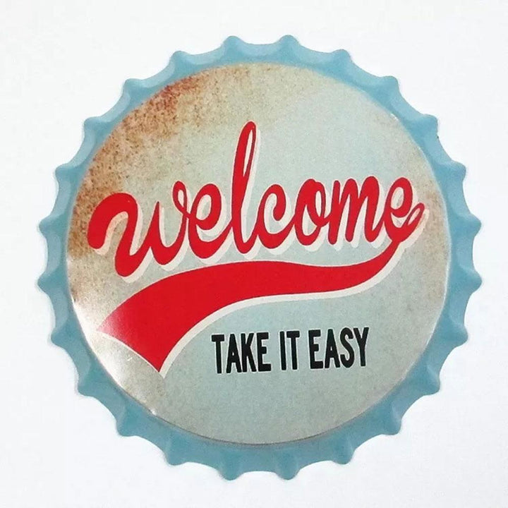 Welcome Take it Easy Beer Cap Metal Tin Sign Poster will adorn the look and feel of your wall. This versatile and durable tin sign, metal wall poster can be stuck in any corner of your room, office, shop, shed, garage or store and it will look just as great. Imported Iron. Fashion & Retro Quality Tinned Skin. Four pre-drilled holes for hanging or you may use double-sided tape.