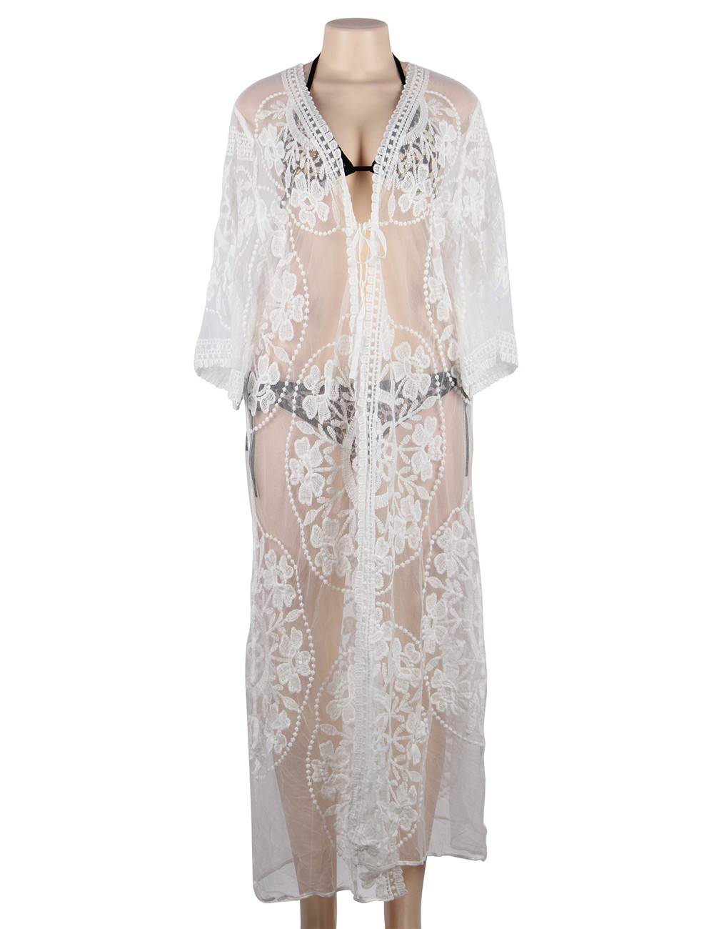 With decadent wide floral lace mandalas printed throughout, our white boho ladies vintage lace cardigan features embroidered detail and reaches the ankles. Beautiful over swimwear or paired with other whites.